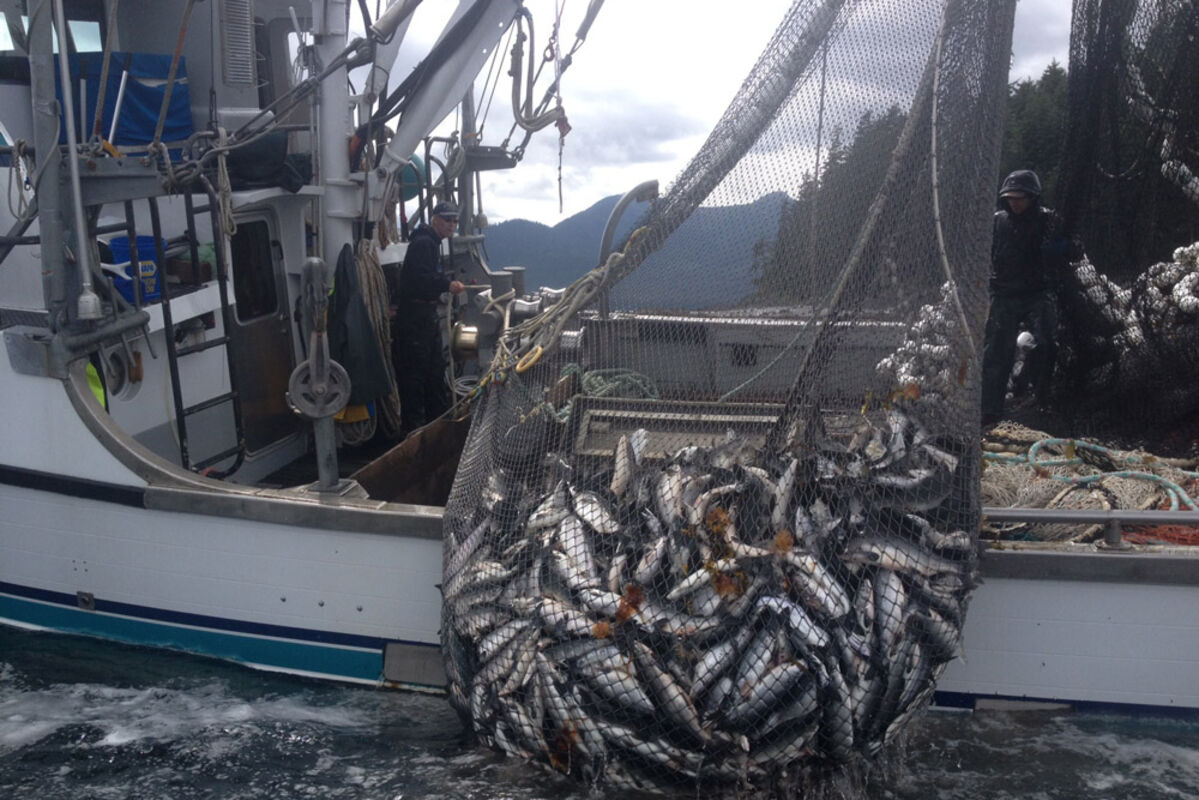 Local purse seiner, F/V Logan T, hauls in a net full of mostly chum salmon.